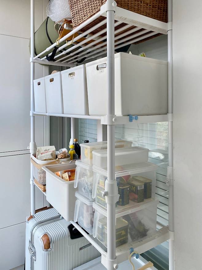 tvN 예능 ‘신박한 정리’ 프로그램을 좋아하는데요. 많은 짐들이 차곡차곡 테트리스 되는 모습을 보면 마음이 편안해지고 우리 집도 싹 다 치워버리고 싶은 마음이 든 달까요? 방송을 보다가 팬트리처럼 사용하기 위해 설치한 행거입니다. 다양한 식 자재 및 생활용품들을 수납하는 공간으로 사용하고 있어요.
