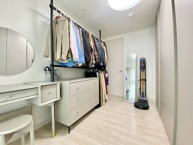 엄마의 의견대로 드레스룸 문을 열었을 때 시선이 먼저 닿는 방향에 붙박이장을 설치해서 다행이다 싶고요. 문을 열고 들어왔을 때 행거가 먼저 보였다면 방이 더 좁아 보이고 지저분해 보였을 것 같다는 생각이 들어요. 역시 엄마들의 삶의 지혜란👍