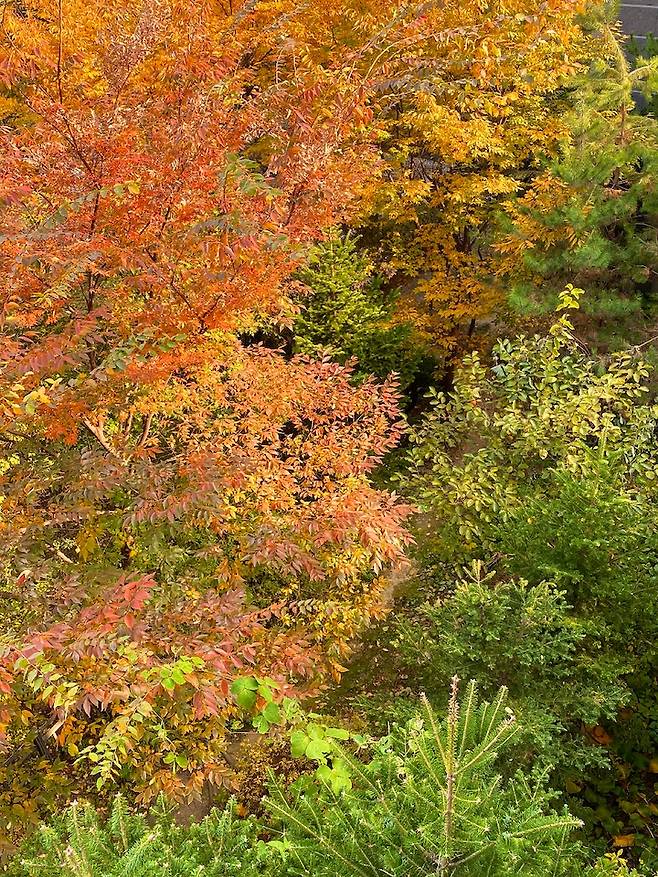 서재 방에서 창밖으로 보이는 풍경들이에요. 3층이라 나무들이 아주 가까이에서 보여서 좋아요! 사실 재택근무를 하기 전에는 집은 저녁과 주말에만 잠깐 있는 공간이었는데, 코로나 시국 이후에 재택을 하고 집에 머무는 시간들이 길어지면서 집과 더 친해진 것 같아요. 빛이 들어오는 시간은 언제인지, 놀이터에서 노는 아이들 소리에 하교 시간이구나 하고 느끼기도 하고요. 가을이 되며 단풍이 들어가는 과정을 매일매일 관찰하는 재미도 있네요.