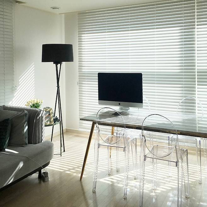 거실엔 창문이 2방향으로 나 있어요. 좌측엔 세탁실 겸 베란다와 연결된 창이 있는데 그쪽엔 팬트리로 꾸며놔서 지저분한 것을 가리기 위해 항상 블라인드를 내려서 지내고 있어요. 빛이 새어 들어오는 느낌이 좋아 커튼 대신 블라인드를 골랐는데 빛이 들어오는 느낌이 좋죠?