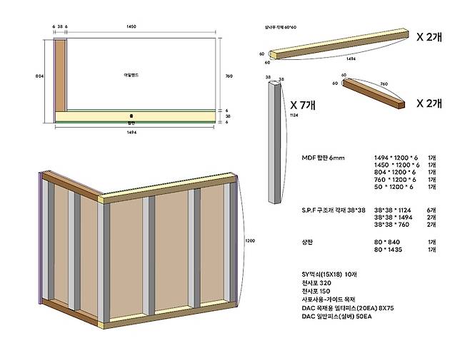 1. 가벽을 세울 위치와 길이를 재단하여 미리 필요한 나무를 계산해 봅니다. 이 과정에서 합판과 각목의 두께까지 계산하여 나무를 주문하는 일이 가장 골치 아팠어요!