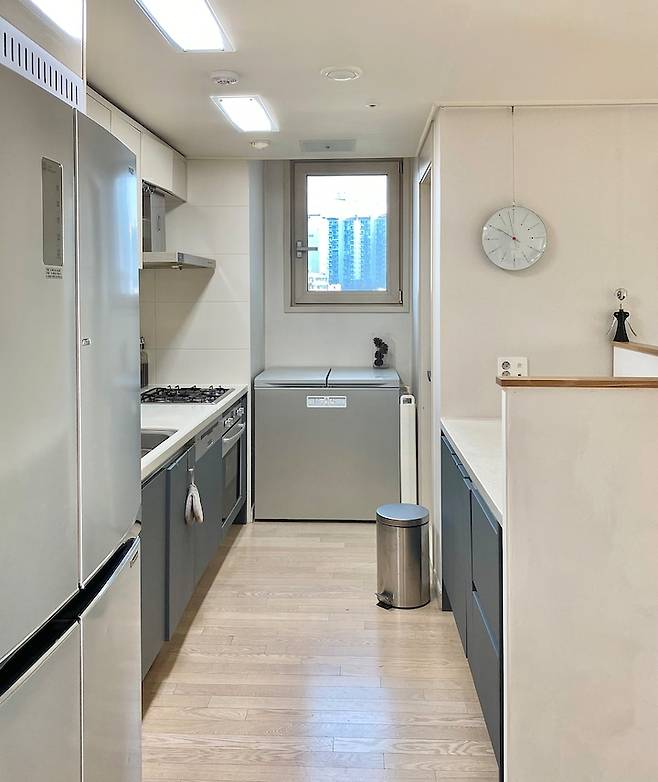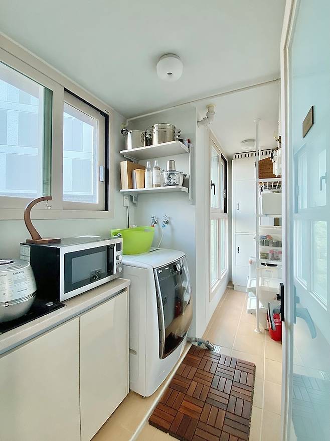 주방에 딸린 베란다 겸 세탁실입니다. 밖에 밥솥과 전자레인지를 두었어요 밥을 하거나 전자레인지를 돌려도 집 안으로 냄새가 들어오지 않아 좋아요.