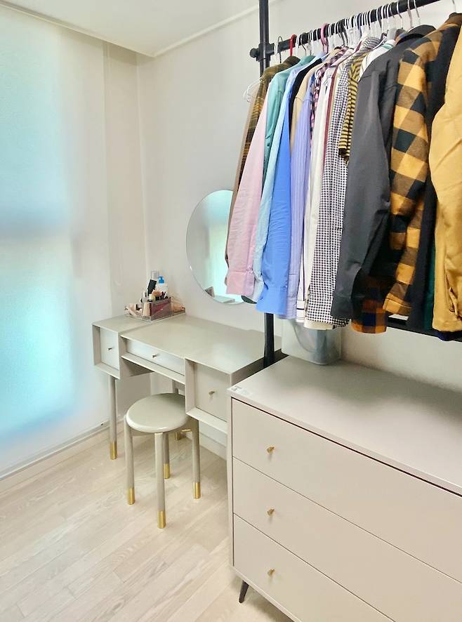 깔끔하게 밝은 그레이톤 가구로 통일시킨 드레스룸 입니다. 붙박이장과 서랍장을 세트로 먼저 사고 나서 나중에 화장대를 골랐었는데요. 소규모 맞춤 가구 공방이라 붙박이장과 서랍장 컬러에 맞게 화장대 컬러를 맞춰주셨어요. 기존 3단 서랍장의 손잡이는 블랙이었는데요. 화장대의 손잡이와 같이 골드 손잡이를 챙겨주셔서 통일 시킬 수 있었습니다.