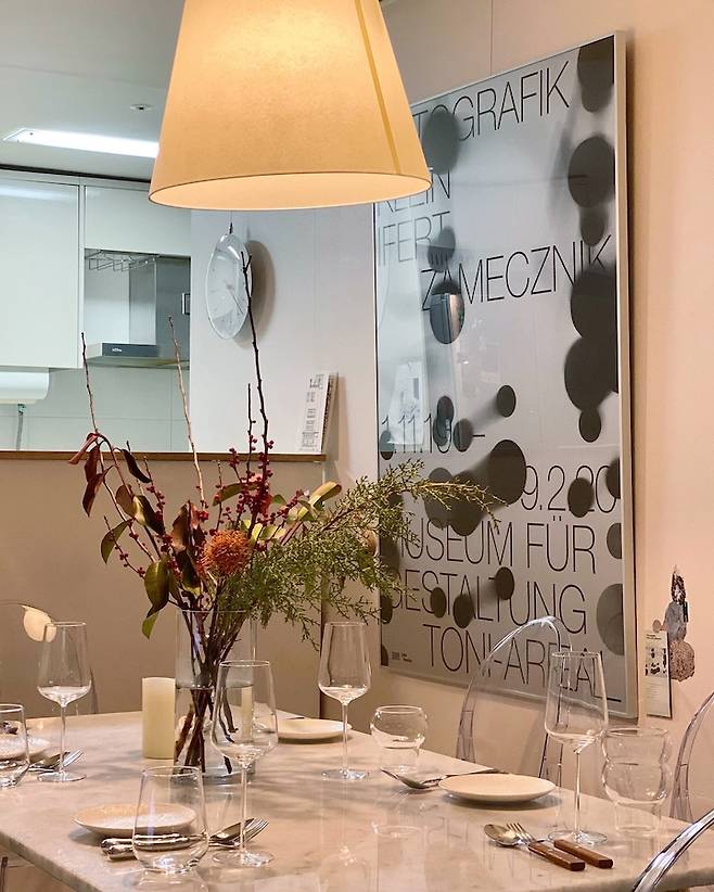 다이닝 테이블은 대리석 테이블인데요. 패턴이 화려하면 쉽게 질릴 듯하여 가장 은은하고 잔잔한 상판을 골라 제작했어요. 대리석 테이블은 무채색의 인위적이지 않은 패턴이 매력적이라고 생각합니다. 적당한 글로시함이 있어서 투명한 소재와 잘 어울리는 것 같아요.
