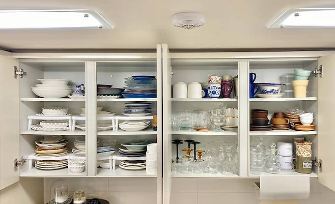 주방의 상부장에는 접시들과 잔을 수납하고, 하부장에는 더 무게가 있고 사용 빈도가 높은 밥&국 그릇, 냄비, 프라이팬 등을 수납하고 있어요. 특히 상부장에서 손이 가장 잘 닿는 낮은 칸에는 자주 사용하는 접시와 컵들을 놓았고, 사용 빈도가 낮은 컵들과 그릇들은 위 칸에 놓았어요.