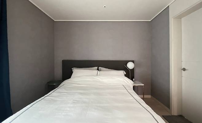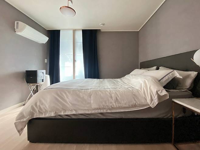 자기 전 조명을 켜고 누워서 핸드폰을 하다가 스르륵 잠드는 침실이에요. 침실에선 딱 잠만 자길 원해서 심플하게 침대와 협탁만 두었어요. 벽지와 커튼도 어두운 컬러들을 골랐고요. 침실에선 협탁 위 조명 이외엔 천장 조명도 잘 켜지 않는 것 같아요.