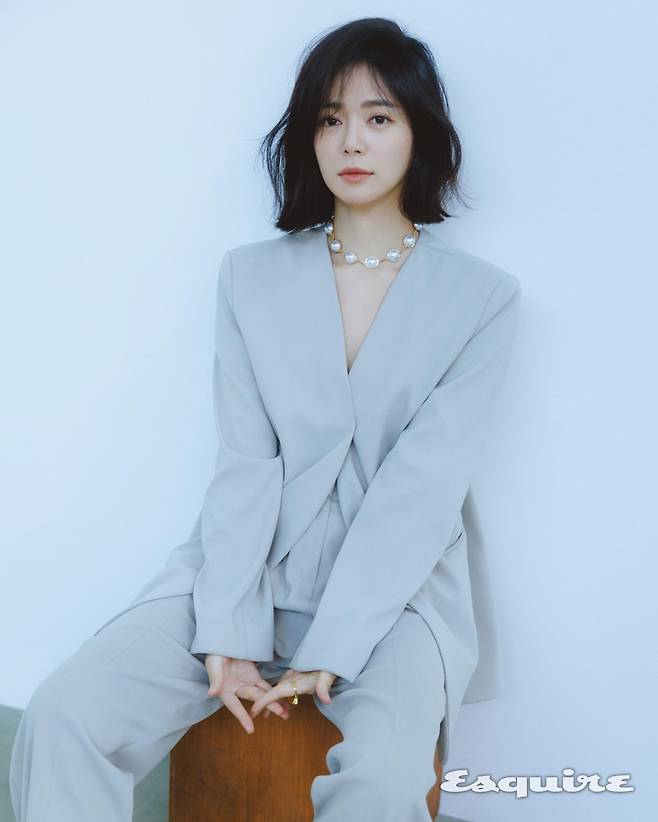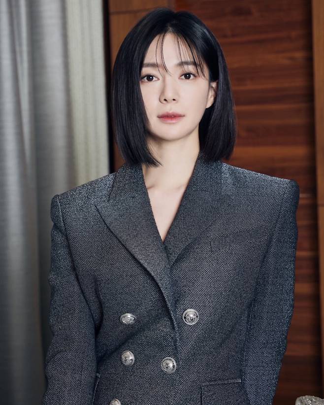 두 번째 사진에서는 짙은 그레이 컬러의 더블 브레스티드 재킷을 착용해 클래식한 분위기를 강조했다. 구조적인 어깨 라인과 은은한 광택의 단추 디테일이 고급스러운 이미지를 부각시킨다. 자연스럽게 뻗은 단발 헤어스타일과 절제된 메이크업이 전체적으로 단정하면서도 도시적인 느낌을 완성한다.
