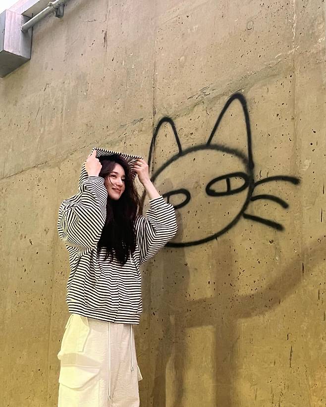 세 번째 사진에서 이엘리야는 스트라이프 패턴의 후드티와 아이보리 컬러의 와이드 팬츠를 매치했다. 벽에 그려진 고양이 낙서 앞에서 후드 모자를 살짝 쓰고 있는 모습이 자유분방하고 발랄한 분위기를 자아낸다. 전체적으로 편안하면서도 트렌디한 스트리트 패션을 보여주고 있다.
