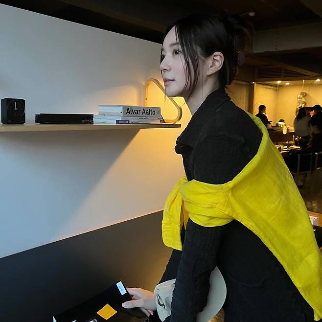 네 번째 사진에서는 블랙 셔츠 위에 밝은 옐로우 셔츠를 어깨에 걸쳐 레이어드한 스타일을 선보인다. 심플한 블랙에 포인트 컬러를 더해 감각적인 컬러 매치를 연출했다. 자연스럽게 묶은 헤어와 미니멀한 액세서리가 어우러져 세련된 데일리룩을 완성한다.
