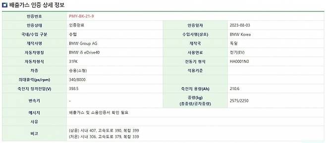 이번 인증을 받은 차량은 i5의 주력 차종인 eDrive40으로, 83.92kWh의 배터리팩과 후륜 싱글모터를 탑재해 최고출력 340마력과 최대토크 43.8kgf·m을 발휘한다.