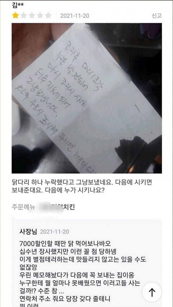 닭다리 누락 시킨 치킨집의 대처