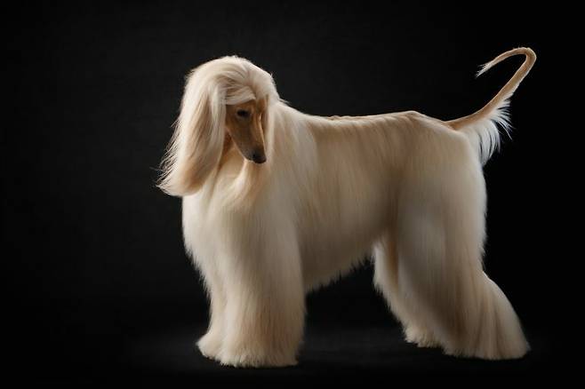 아프간 하운드도 털이 아주 길게 자라는 대표적인 장모종 견종이에요. 단일모를 가지고 있어 털 빠짐은 심하지 않아요.