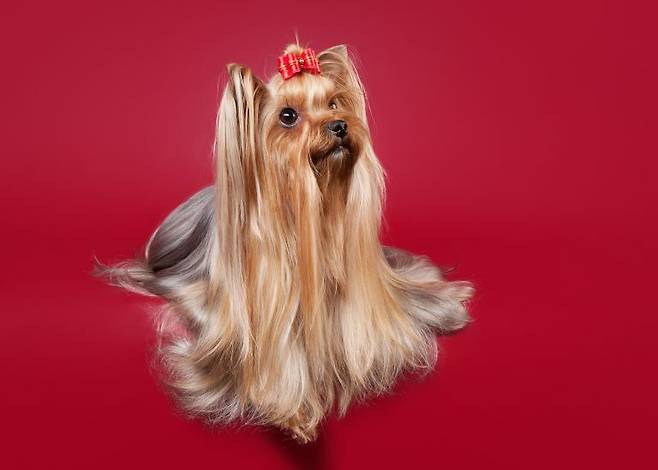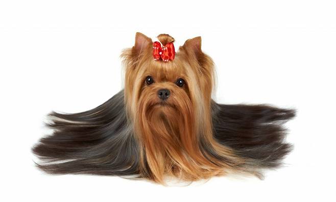 요크셔 테리어는 말티즈와 비슷한 털을 가지고 있어요. 바닥까지 닿을 정도로 길게 자라는 털, 털이 한 겹인 단일모 그리고 윤기나는 부드러운 털을 가지고 있답니다. 마찬가지로 털이 쉽게 엉키기 때문에 빗질을 자주 해줘야 해요.