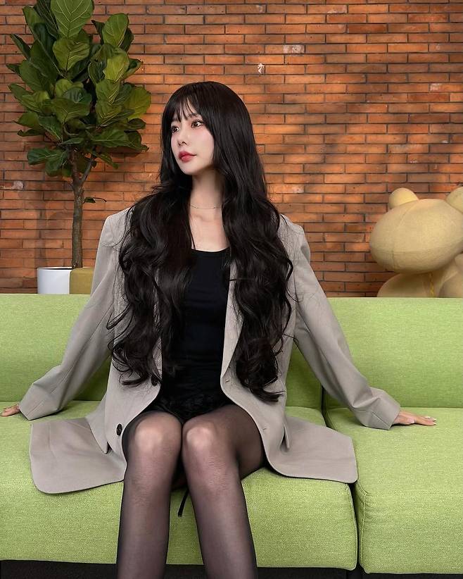 밝은 벽돌 배경과 연두색 소파 위에 앉은 그녀는 단단한 시선으로 카메라를 응시한다. 긴 웨이브 헤어와 자연스러운 메이크업, 그리고 탄탄하게 떨어지는 테일러드 재킷이 어우러져 단정한 듯 관능적인 스타일을 완성한다. 안쪽에 매치한 블랙 톱과 스타킹이 재킷의 중성적인 매력을 부드럽게 감싸며, 시선의 중심을 자연스럽게 다리 라인으로 이어지게 한다.