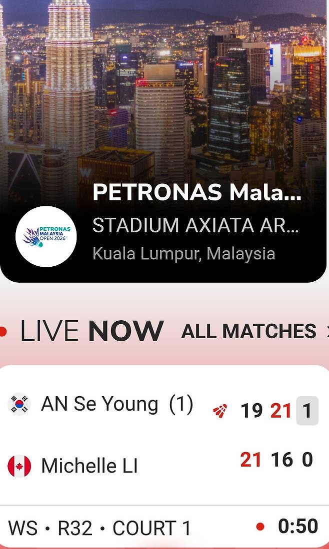 6일 열린 말레이시아 오픈 32강전에서 안세영은 1세트를 19-21로 내주며 일격을 당했으나, 2세트 들어 특유의 끈질긴 랠리와 노련한 경기 운영을 회복하며 21-16 승리를 거뒀다. 세트 스코어 1-1 상황에서 이제 두 선수는 16강 티켓을 놓고 마지막 3세트가 현재 진행 중이다.