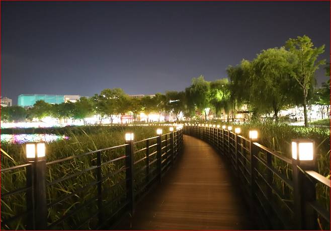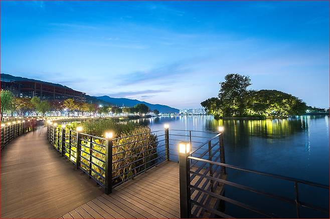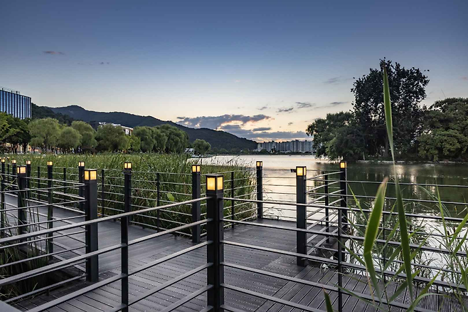 호수를 따라 조성된 수변 데크는 평탄합니다. 그래서, 가벼운 운동이나 유모차 산책에도 무리가 없습니다. 바늘꽃과 연꽃, 갈대가 계절에 따라 풍경을 바꾸고, 왕벚나무와 버드나무 가로수는 겨울이면 가지의 선을 또렷하게 드러냅니다. 무엇보다도 수면과 가까운 동선 덕분에 물결과 바람의 변화를 바로 느낄 수 있습니다.