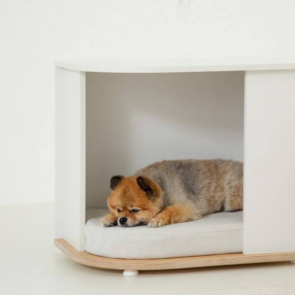 협탁 겸용으로 사용할 수 있는 강아지 하우스입니다. 자작나무를 사용한 제품으로 튼튼하다는 장점이 있어요. 화이트톤으로 인테리어 효과도 좋습니다. 하우스 안에 깔려 있는 쿠션은 메모리폼으로 관절이 안 좋은 강아지에게도 추천합니다.