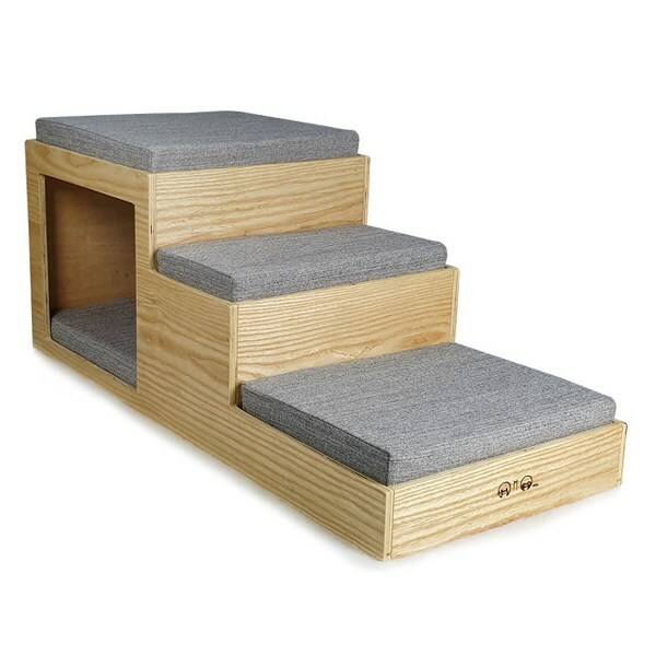 3단 계단으로, 강아지 하우스가 함께 있는 제품이에요. 수납도 가능해 공간 활용하기 아주 좋아요. 마찬가지로 하우스 크기는 작은 편이라 소형견용으로 추천해요. 원목 소재의 제품이라 아주 견고하고 내구성도 좋아요.