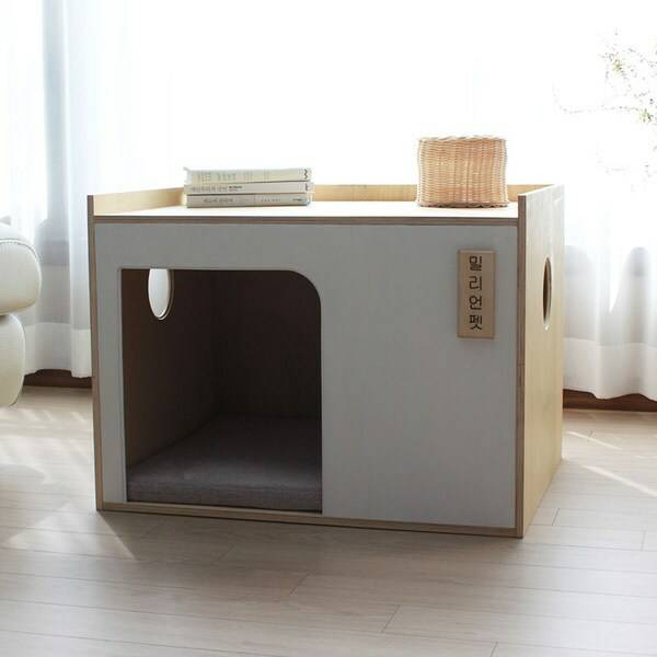 윗면이 평평하고 소재가 튼튼해서 침대나 소파 옆에 두고 협탁 겸용으로 사용할 수 있는 강아지 하우스가 있어요. 협탁과 강아지 하우스 모두 필요한 경우 사용해 보는 걸 추천해요. 브라운 원목, 화이트 원목, 라탄 등 소재가 다양해 인테리어 효과를 주는 제품도 많습니다.