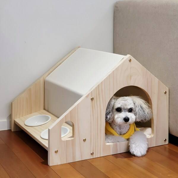 강아지 밥그릇이 달려있는 밥그릇 일체형 강아지 하우스도 있어요. 공간 활용에 조금은 도움이 될 수 있답니다. 원목 소재로 내구성이 좋다는 것도 장점이에요. 지붕은 천으로 통기성에 좋답니다.