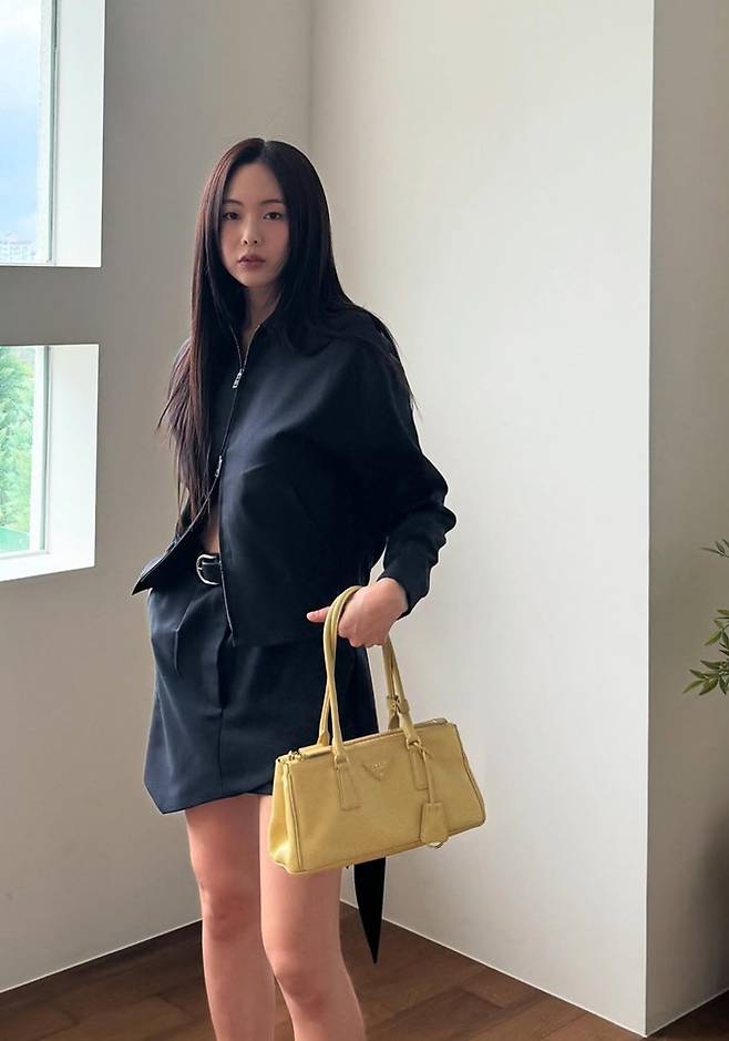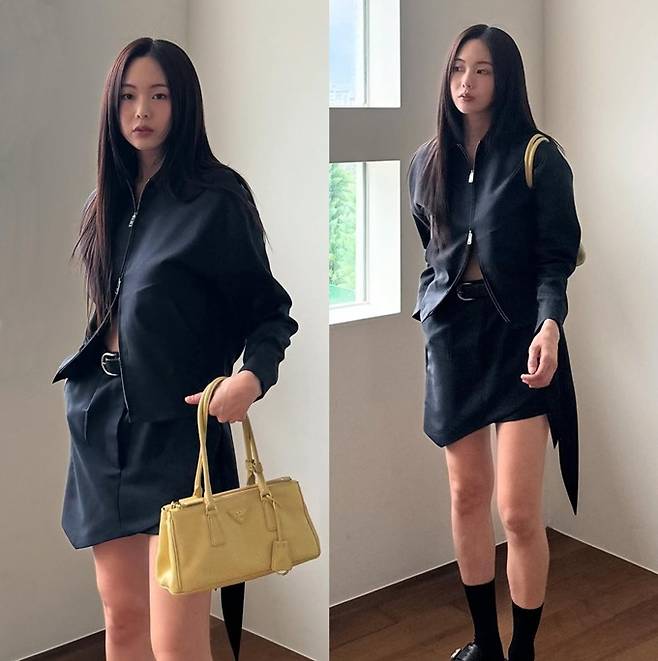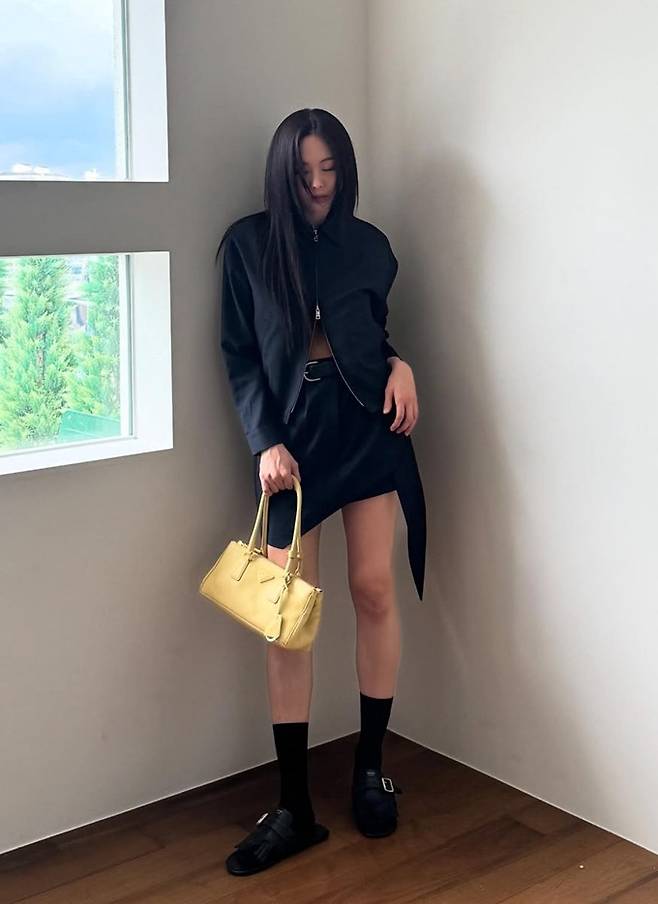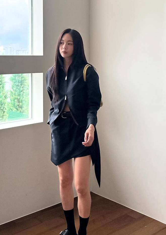 공개한 사진에서 금새록은 블랙 언발란스 미니 스커트와 지퍼를 반쯤 푸른 재킷의 투피스룩으로 시크하면서도 멋스러운 스타일을 완성했다.