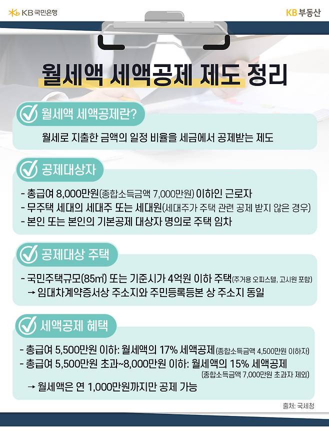 최근 전세에서 반전세나 월세의 선호도가 높아지는 이유 중 하나로 정부의 월세액 세액공제 혜택을 꼽는 이들도 많습니다. 월세액 세액공제는 총급여 8,000만원(종합소득금액 7000만원) 이하인 무주택 세대의 세대주 또는 세대원인 근로자(세대주가 주택 관련 공제 받지 않은 경우)가 전용 84㎡ 또는 기준시가 4억원 이하 주택(주거용 오피스텔, 고시원 포함)을 주택 임차한 경우에 적용되는데요.