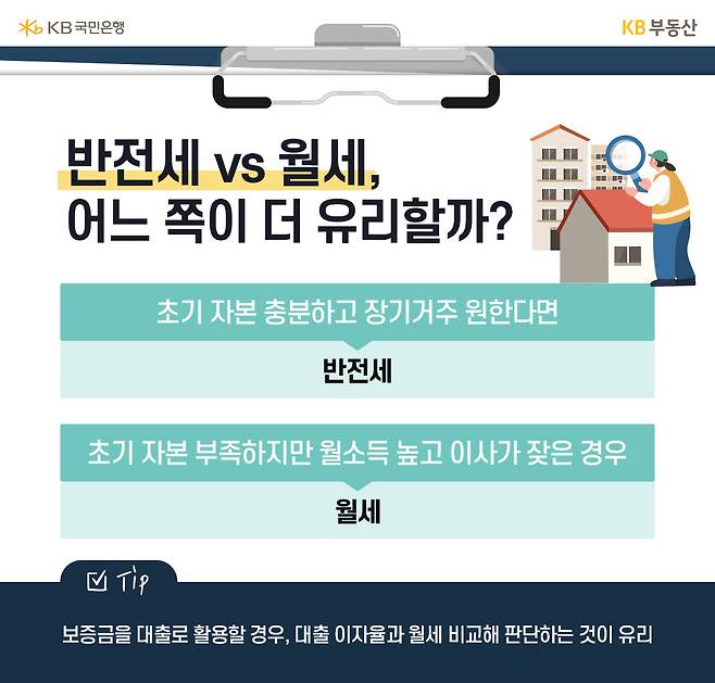 그렇다면 반전세와 월세 중 어떤 걸 선택하는 것이 좋을까요? 우선 각자의 상황에 따라 반전세 또는 월세가 유리할 수 있는데요. 만약 초기 자금이 충분해 높은 보증금을 감당할 수 있거나 장기 거주 계획을 세우고 있는 분들이라면 월세 부담을 줄이고 안정적인 거주를 할 수 있는 반전세가 유리할 수 있습니다.
