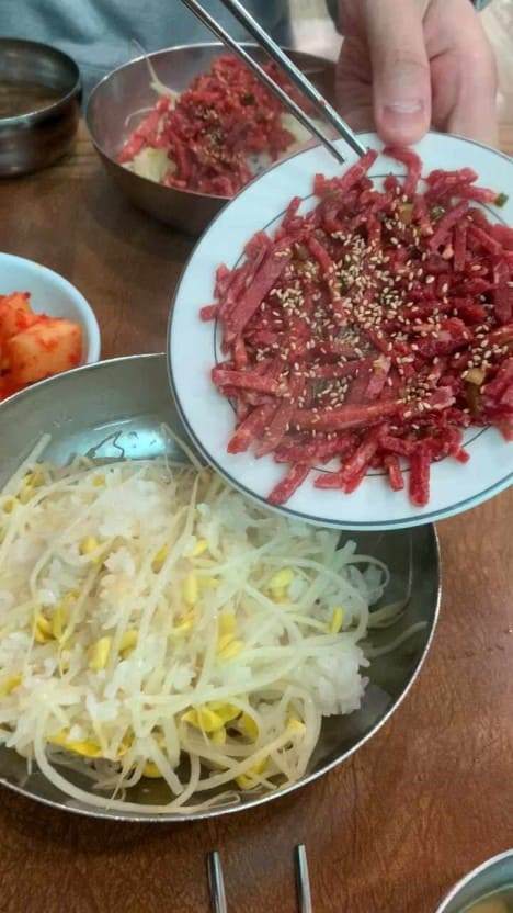 메뉴는 오로지 콩나물밥 하나뿐인데, 여기에 싱싱한 육회와 비법 양념장을 듬뿍 올려 비벼 먹는 맛이 으뜸이죠. 쫄깃쫄깃한 식감의 콩나물과 입에서 살살 녹는 육회, 거기에 매콤 달콤한 양념장까지 더해지니 밥 한 그릇이 그야말로 술술 넘어갑니다.