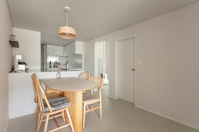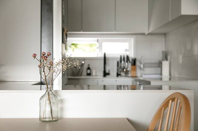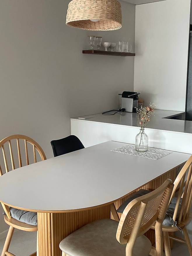그렇게 완성된 주방은 이런 모습이에요. 제 로망 중 하나가 아일랜드와 식탁이 모두 있는 주방이었는데 모든 것을 실현할 수 있었답니다. 시공 과정 중엔 식탁을 방으로 넣어 다이닝 공간을 만들지, 거실로 뺄지 고민했지만 결국 주방과 식사 공간이 붙어있는 공간을 만들었어요. 실용성과 분위기를 모두 잡아 아주 편안하게 사용하고 있답니다.