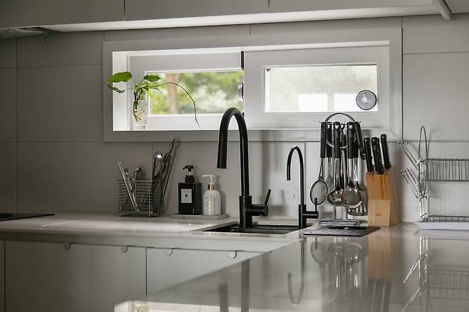 주방의 메인 컨셉은 화이트 바탕에 블랙 포인트였어요. 그래서 인덕션과 수전, 싱크볼을 블랙 제품으로 찾아서 넣고, 고민이 되었던 정수기도 블랙으로 맞춰서 넣었는데 원하는 모습대로 잘 나왔답니다. 정수기를 어떤 제품으로 할지 고민이었는데, 파라곤 필터에서 나온 언더싱크 정수기로 선택하길 잘 한 것 같아요. 전기도 먹지 않고, 탄성 필터로 되어 1년에 한 번만 필터를 갈아도 된다는 큰 장점이 있거든요.