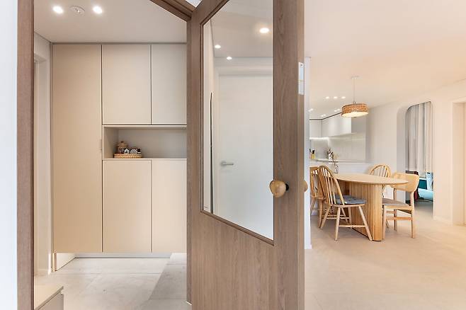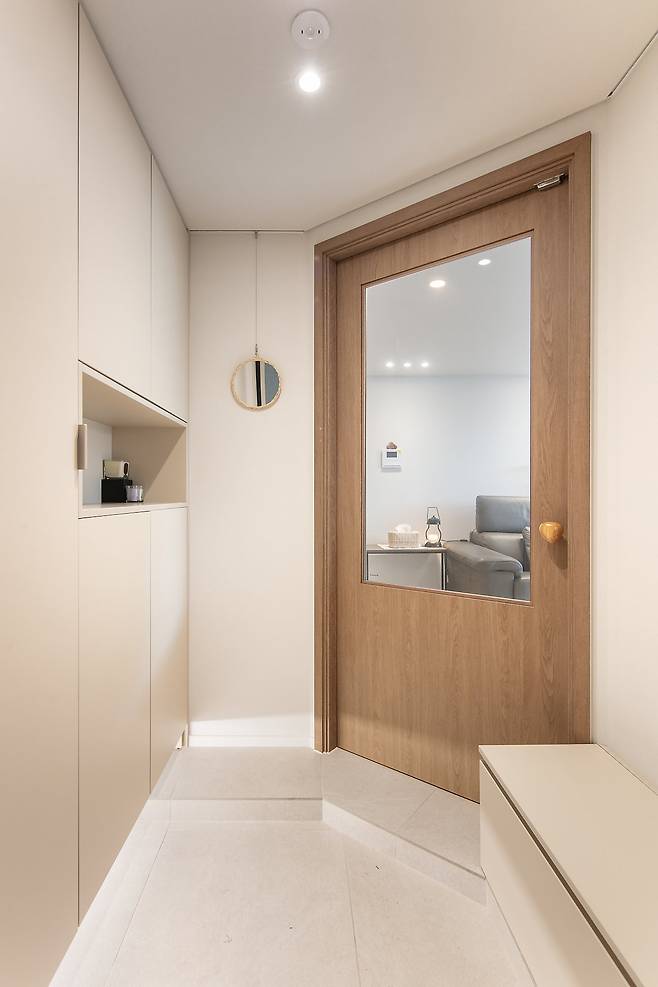 현관 시공에서 중요했던 것은 중문의 방향이었어요. 문을 열었을 때 화장실이 바로 보이는 게 싫었거든요. 문 열리는 각도까지 신경 써서 사선으로 배치했고 매우 만족스러운 중문이 탄생했답니다. 집에 오시는 손님들마다 중문 멋지다고 칭찬해 주세요.