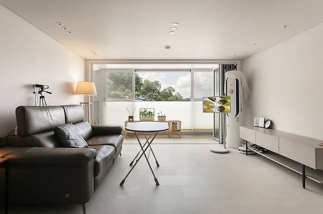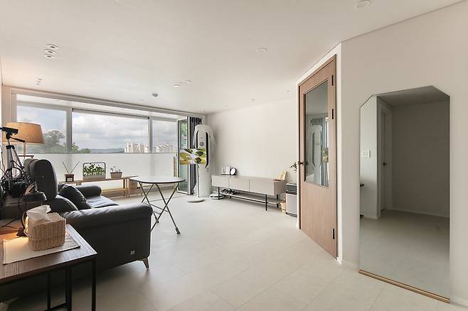 이전 집에서는 소파와 TV 쪽 벽면이 반대로 되어있었는데, 저희는 과감히 배치를 바꾸어서 하늘도 볼 수 있고, 소파에 앉아서 집에 오는 사람과 눈을 맞출 수 있도록 했습니다.