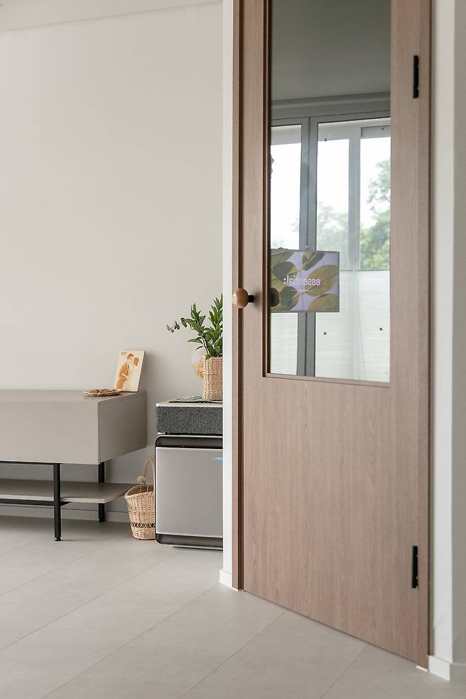 그럼 집으로 들어가 볼까요? 집의 첫인상을 결정하는 현관은 사선 중문이 장식하고 있어요. 알루미늄 슬림 도어로 할지, 일반 도어로 할지 고민했는데, 집 분위기상 무게감 있는 일반 문이 나을 것 같아서 영림도어 일반 문으로 선택했고, 손잡이도 그와 비슷한 톤으로 골라주었습니다.
