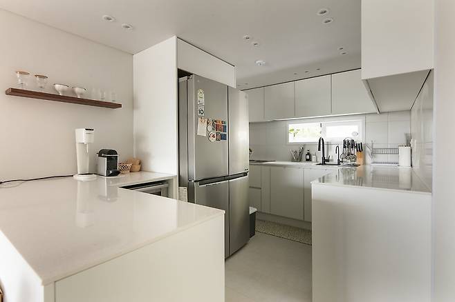 2베이 구조의 가장 큰 골칫거리, 주방. 시공을 하면서 이 주방의 배치를 어떻게 할지 고민이 많았어요. 혼자 유튜브를 보면서 그린 도면이 4개나 될 정도로요. 또 신혼 혼수로 장만한 뚱뚱이 냉장고도 바꾸어야 하나 생각이 많았습니다.