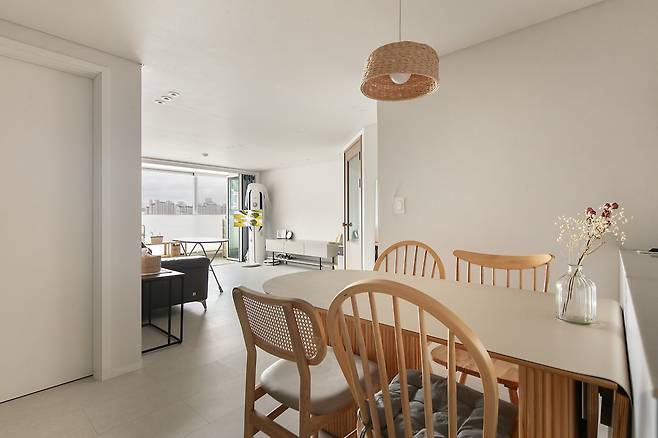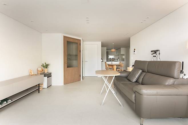 거실을 소개해 드릴게요. 문을 열고 들어오면 바로 보이는 따뜻한 무드의 공간입니다. 집의 톤을 결정짓는 마루는 아이보리-베이지 톤으로 결정했고, 벽지 또한 밝으면서 따뜻한 톤의 벽지를 선택했어요. 이런 따뜻한 느낌이 하늘 뷰와 잘 어우러진답니다.