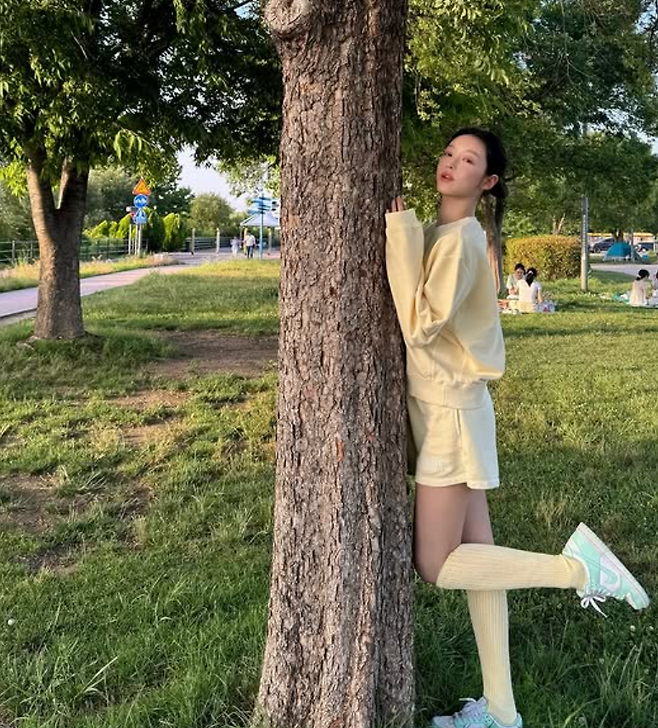 유아 님은 노란색 셋업룩으로 봄과 잘 어울리는 산뜻한 캐주얼룩을 선보였어요. 옐로우 맨투맨에 짧은 팬츠, 그리고 노란색 니삭스로 개나리 같은 패션이었죠. 신발은 민트색 나이키 운동화로 발랄한 코디의 분위기를 한껏 업그레이드시켰더라고요.