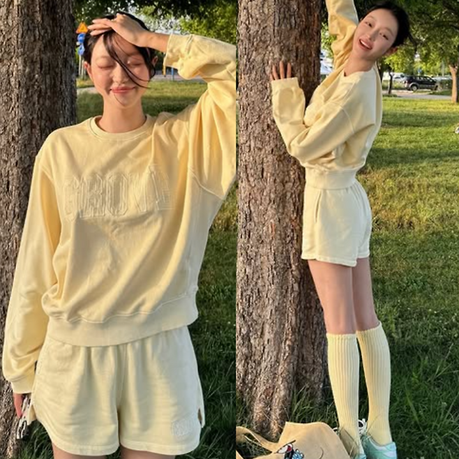 옐로우 맨투맨 & 쇼츠 셋업으로 산뜻한 분위기
