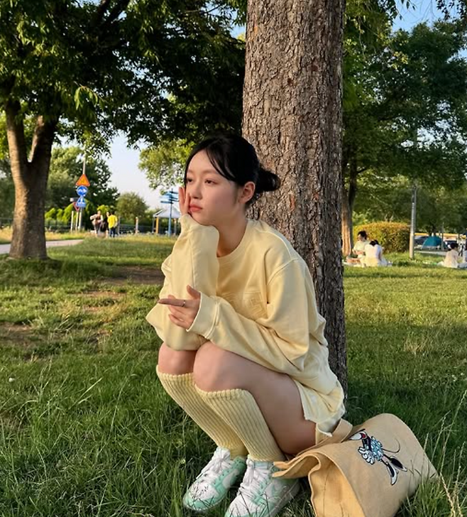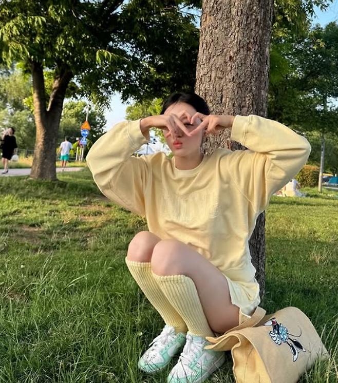 유아 님은 노란색 셋업룩으로 봄과 잘 어울리는 산뜻한 캐주얼룩을 선보였어요. 옐로우 맨투맨에 짧은 팬츠, 그리고 노란색 니삭스로 개나리 같은 패션이었죠. 신발은 민트색 나이키 운동화로 발랄한 코디의 분위기를 한껏 업그레이드시켰더라고요.