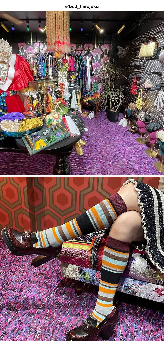일본 영화 <헬터 스켈터>, <혐오스런 마츠코의 일생>이 떠오르는 ‘베드 빈티지’ 하라주쿠점은 과감하고 화려한 아이템이 가득한 빈티지 보물창고다. 쨍한 컬러감과 패턴 위주의 스커트, 드레스 등 어디서도 찾아보기 어려운 아이템이 많고, 개성 넘치는 스태프들이 제품을 고르는 데 친절히 도움을 주기도 한다.