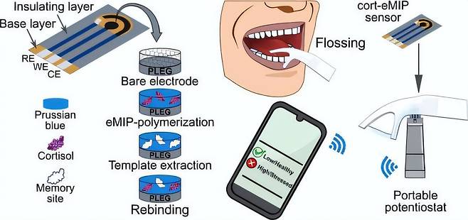 미국 연구팀이 치실을 통한 스트레스 측정 방법을 제시했다. 일회용으로 사용할 수 있도록 만들어진 치실 픽의 손잡이 부분에 타액(침) 성분을 분석할 수 있는 센서를 탑재한 방식이다.