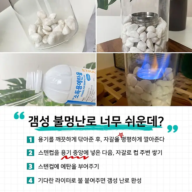 몇 번에 시행착오 끝에 성공하긴 했는데, 차라리 아예 자갈 쌓기 전에 에탄올을 살짝 부은 채로 용기에 집어넣는 것도 방법 같았네요. 물론 그 뒤에 수평에 맞게 자갈을 컵 주변에 놓아주는 것도 중요한지라.. 자신에게 맞는 순서로 픽하시면 될 것 같아요.
