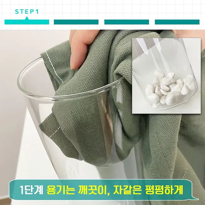 모든 준비를 마쳤다면 이제 본격 불멍난로 만들기에 돌입해볼게요. 마른 수건으로 유리용기를 깨끗하게 닦아준 는 원예용 자갈을 그 안에 깔아줄게요.