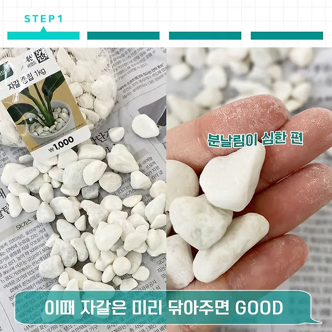 이때 주의할 점은 자갈에 생각보다 가루가 많이 묻어 있어서, 저는 신문지부터 먼저 세팅했다는 말씀. 그 후, 물을 적신 헝겊으로 자갈을 슥슥 닦아줬네요.