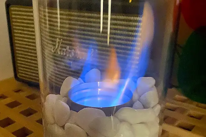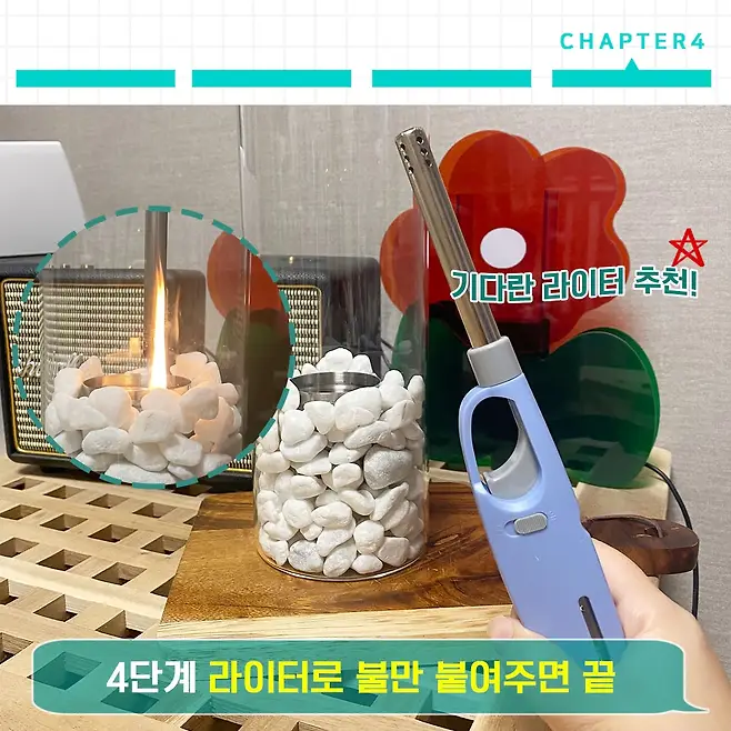 이때 필요한 건 뭐다? 아주 아주 long한 라이터죠. 유리 용기가 긴 형태라 짧은 라이터는 넘나 힘들다는거. 불만 붙여주면 불멍난로 바로 완성이에요.
