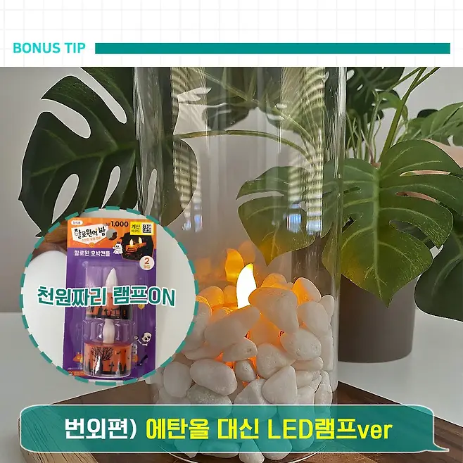 모든 과정은 동일한데 스테인레스 컵 대신 LED캔들을 자갈 사이에 쏙 넣어주면 끝. 오렌지빛 불이 반짝반짝거리는데, 요것도 나름대로 느낌 있음~ 참고로 다이소에서 1,000원에 구매했음요.