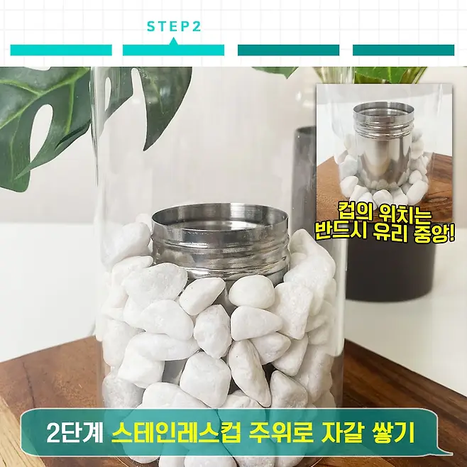 STEP2 스테인레스 컵이 유리 용기 중앙에 오게 넣은 다음, 자갈로 컵 주변 쌓기