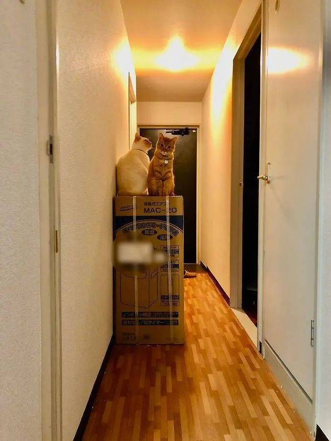 주인은 새로 온 물건을 확인하고 싶지만, 상자에 대한 고양이의 강한 애착을 알기에 쉽게 손댈 수 없는 상황입니다.