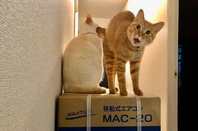 집안의 고양이가 이미 상자를 자신의 '왕좌'로 선점하고 당당히 앉아 있는 것입니다.