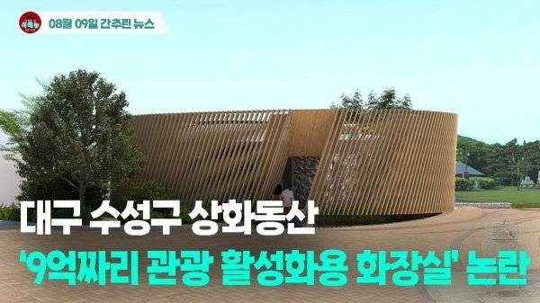"대구 수성구가 수성못 상화동산 공중화장실 리모델링에 9억 원을 투입합니다. 올해 12월 15일 준공 목표입니다. 화장실에 예술작품을 접목해 품격을 높이고 수성못 관광 활성화를 꾀한다는 취지입니다. 95.4 제곱미터 규모의 화장실에 천연목재 외부 디자인을 적용해 주변 경관과 조화를 이루게 하고, 이용 편의를 위한 완경사 램프도 조성합니다. 곡 유리 벽면으로 자연채광 및 외부조망이 가능하도록 하고, 냉·난방기 등 편의시설과 주변 디자인 조명을 설치합니다."