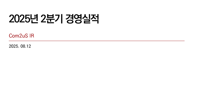 일 시: 2025년 8월 12일(화) 10:00 참 석: 컴투스 남재관 대표, 이주환 SB총괄대표, 한지훈 게임사업부문장, 김동희 IR 실장 등 발표내용: 컴투스 2025년 2분기 실적 및 향후 전략